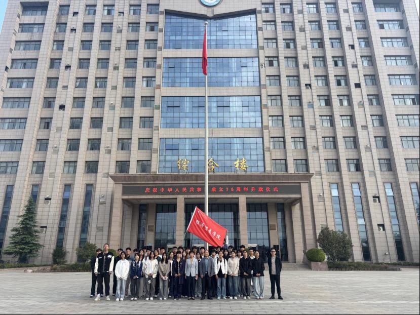2025年9月29日早晨,校团委在综合楼前广场隆重举行了庆祝新中国成立76周年主题升旗仪式,院党委书记赵方,副书记李二亮以及师生代表30余人参加了此次升旗仪式。