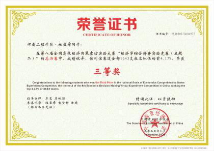 全国高校经济决策虚仿实验大赛是由中国商业经济学会主办的专业特色鲜明的重要赛事,具有广泛影响力。比赛历经校赛、省赛、区域赛和全国总决赛,采用晋级比赛制进行。此次比赛经济贸易学院自去年11月份组队,35支代表队105人参加,经过校赛及省赛,9支代表队27人晋级区域赛。在区域赛中,有4支代表队12人获得三等奖,1只代表队获得二等奖并晋级全国总决赛,最终取得全国总决赛三等奖的佳绩。