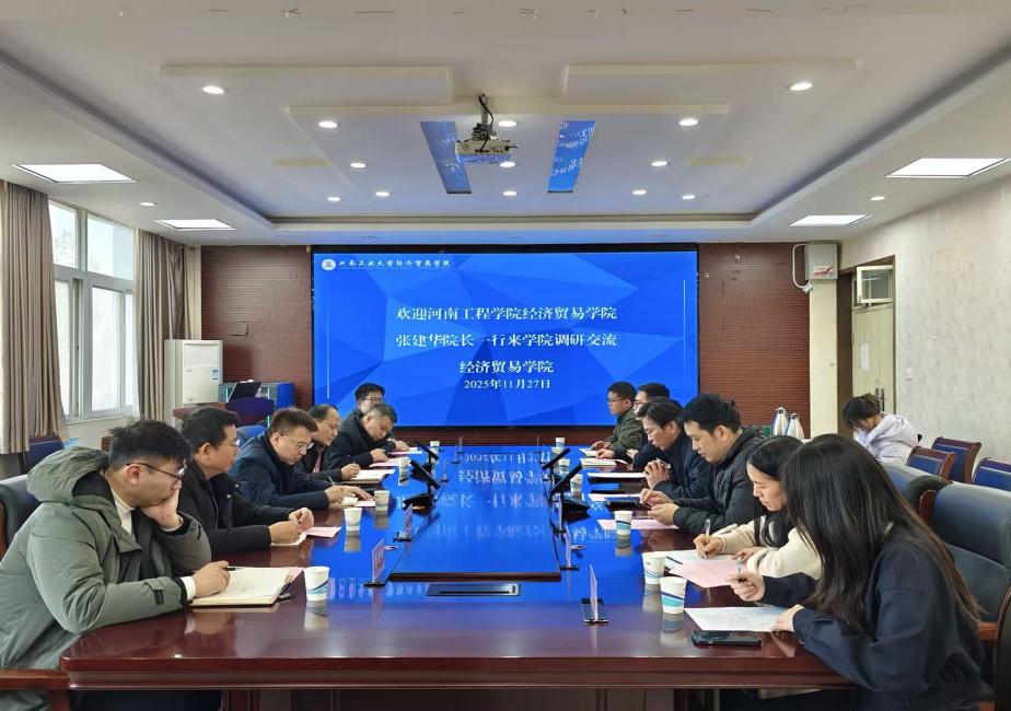 为精准谋划“十五五” 时期经济贸易学院发展蓝图,系统提升学科专业建设、师资队伍建设和科研发展水平,持续提升人才培养质量,11月27日,院长张建华带领班子成员及两名青年博士前往河南工业大学经济贸易学院开展专题调研,河南工业大学经济贸易学院领导班子及相关科室负责人参加。
