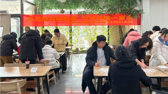 冬至阳生春又来,支部共建暖意浓。为弘扬中华优秀传统文化,增进支部间交流互动,营造团结和谐、积极向上的工作氛围,12月18日中午,国资与实验室管理党支部与经济贸易学院教工党支部在南校区龙源餐厅一楼联合举办了“冬至团圆同叙情,饺香融情一家亲”主题党日活动。两个支部的党员及部分群众代表齐聚一堂,在欢声笑语中共迎传统节气,感受集体温暖。