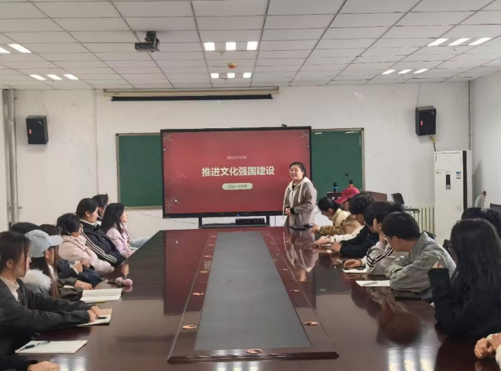为深入推进文化自信自强,强化爱国主义教育。11月3日,经济贸易学院在9B317组织开展以“推进文化强国建设”为主题的培训。本次培训由22级辅导员宋琰珂主讲,我院发展对象共21人参加。