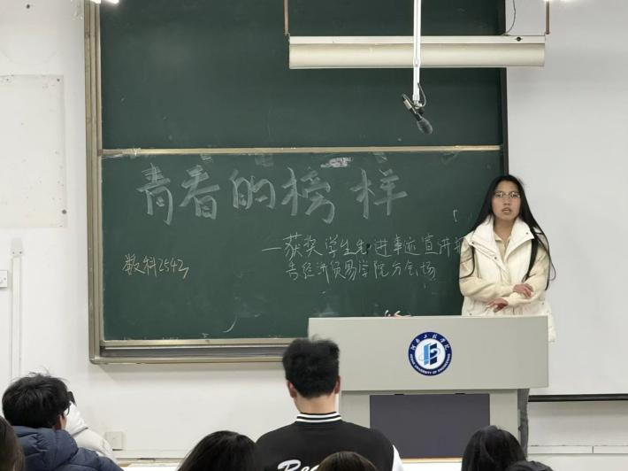 为全面推动和深化资助育人工作,响应学校号召,充分发挥我校优秀大学生在广大同学中的示范引领作用,2026年3月18日,经济贸易学院于七号楼举办“逐梦青春 励志前行”国奖励志宣讲活动,本次宣讲分别由经济学2441杜桐彤、国际经济与贸易2442吴潇颖两位获奖学子担任主讲,学院2025级全体学生参与。